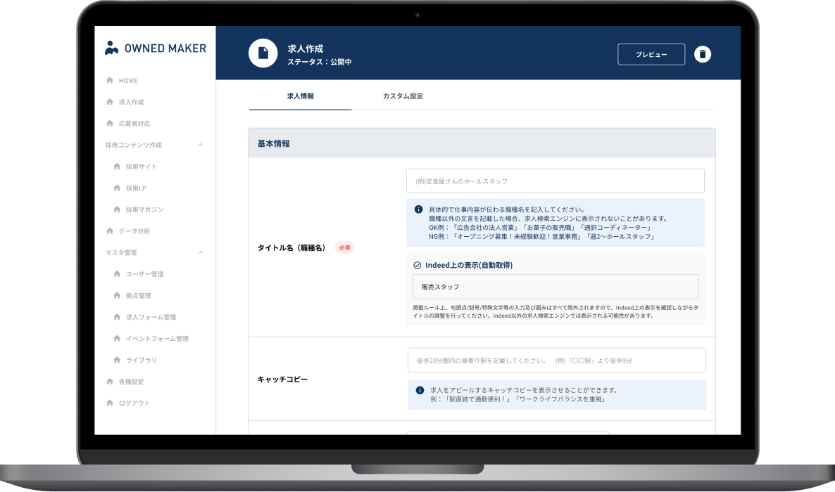 管理画面からフォーマットに沿って求人作成するだけで、求人情報がIndeed PLUS/求人検索エンジンに自動連携されます。