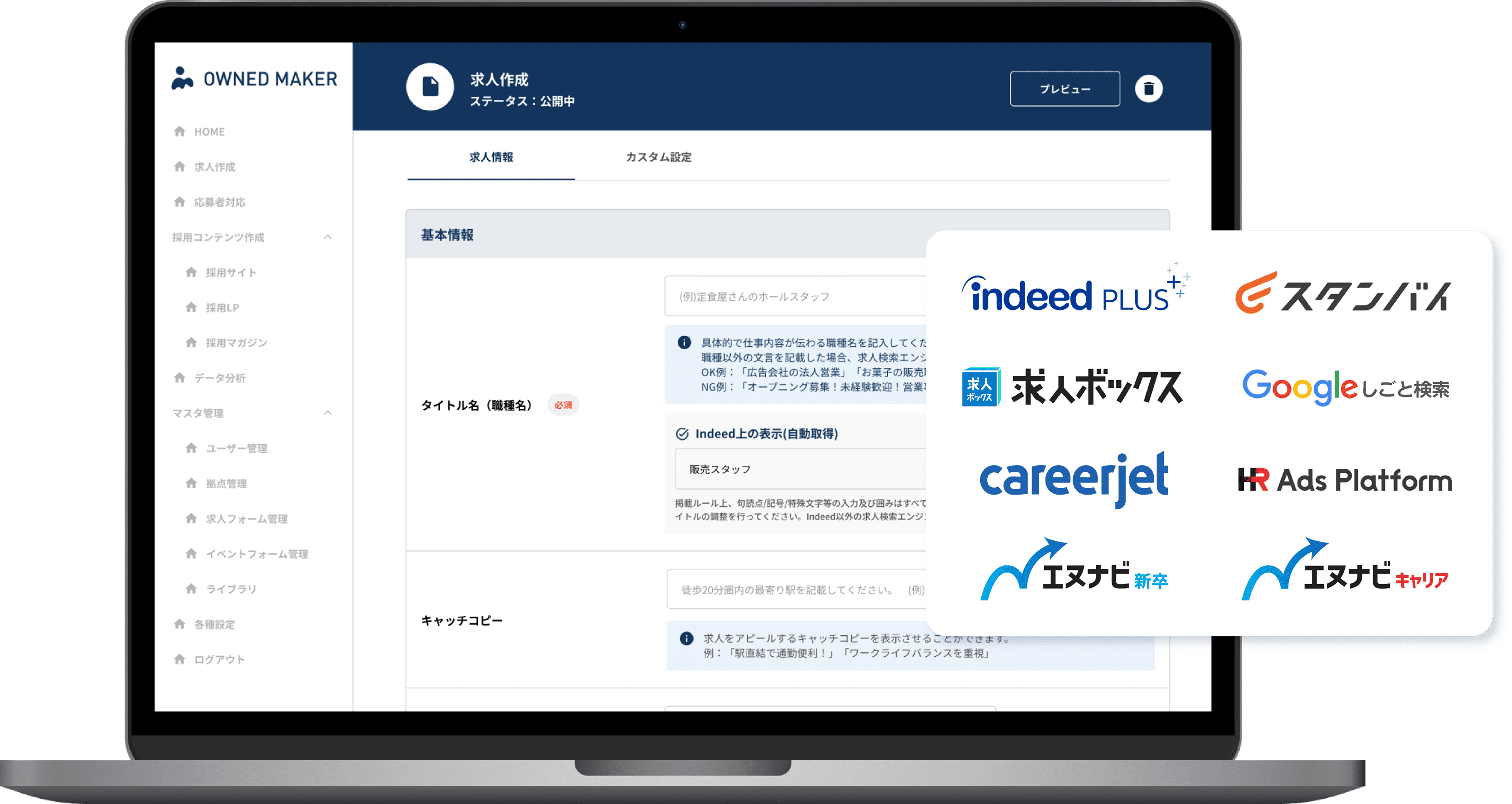 オウンドメーカーで公開中の求人はIndeedPLUS、HR Ads Platformなどの求人配信プラットフォームや、スタンバイ、求人ボックスをはじめとした主要求人検索エンジンに自動連携されます。